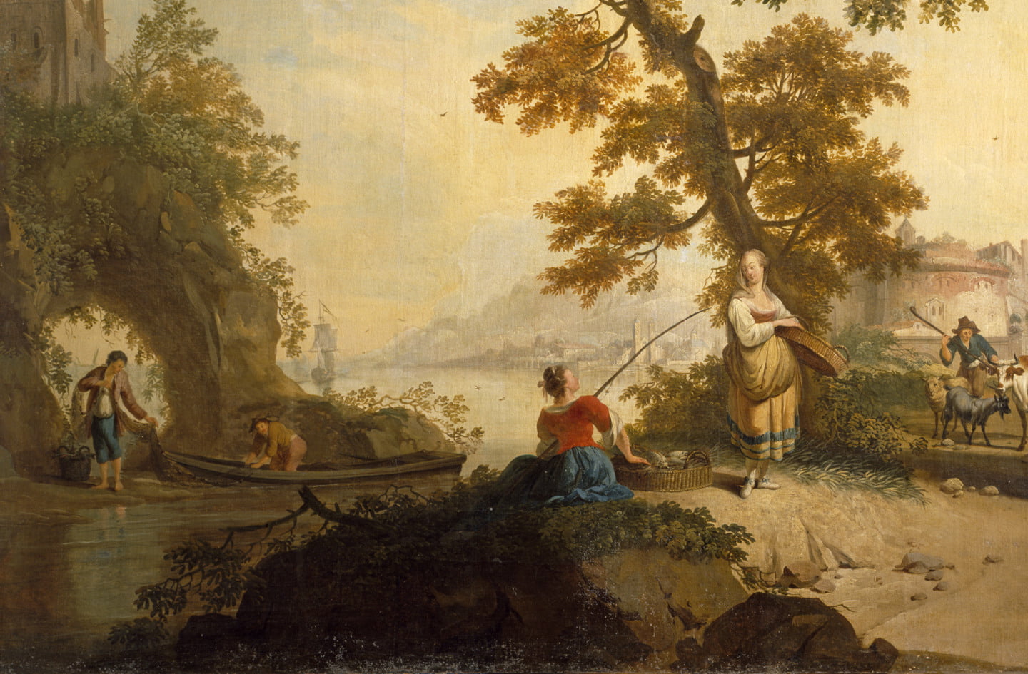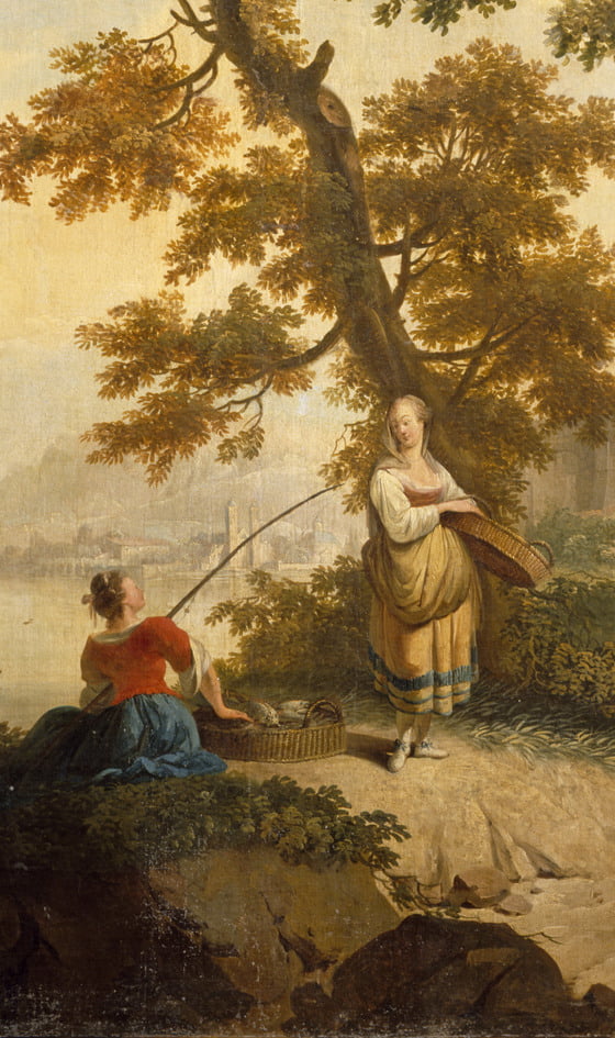 These large paintings of rustic folk going quietly about their business are key to the congenial atmosphere that the designers Mewés and Davis provided for Mrs Greville in this room. Large expanses of sky and cloud introduce light and air, while trees twisting up the vertical compositions bring a sense of elegant, sinuous movement. Derived from pastoral rococo models, they were probably originally installed in a similar room in France, or more likely somewhere in the Low Countries, where such painted decorations were particularly popular in the 18th century.
