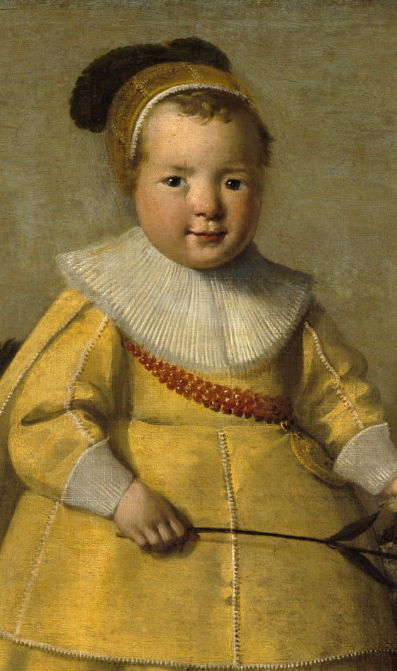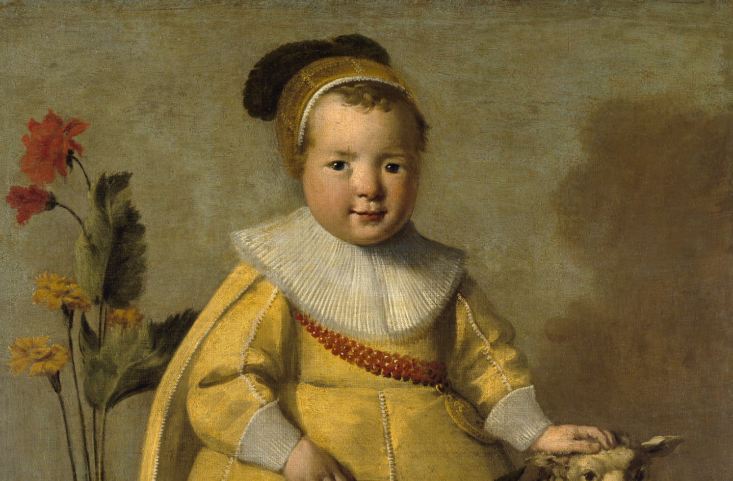 A partially-legible inscription on this Dutch portrait identifies the date of the picture and the age of the child, but not the sitter. All children of this age wore skirts although this figure is identified as a boy by the gold medal attached to his waist. The placid sheep and wild flowers, which grow almost as tall as the boy himself, allude to the Arcadian realm of simplicity and innocence with which wealthy patrons were often keen to associate their offspring. The worn paint surface makes identifying the artist difficult, although it has been attributed to Cesar van Everdingen and the young Aelbert Cuyp, who both produced comparable works.
